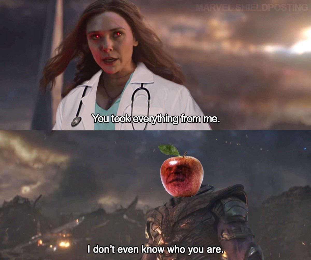 Trên mạng giờ đây vẫn lưu truyền tấm ảnh meme kinh điển từ Endgame, trong đó Scarlet Witch nói với Thanos rằng “Ngươi đã lấy mọi thứ từ ta” (“You took everything from me”), chỉ để nhận lại câu trả lời của Thanos là “Ta còn không biết ngươi là ai” (“I don’t even know who you are”). Chính xác thì Thanos không biết Scarlett là ai thật, bởi vì người tình của cô, Vision chết dưới tay một biến thể khác của Thanos.