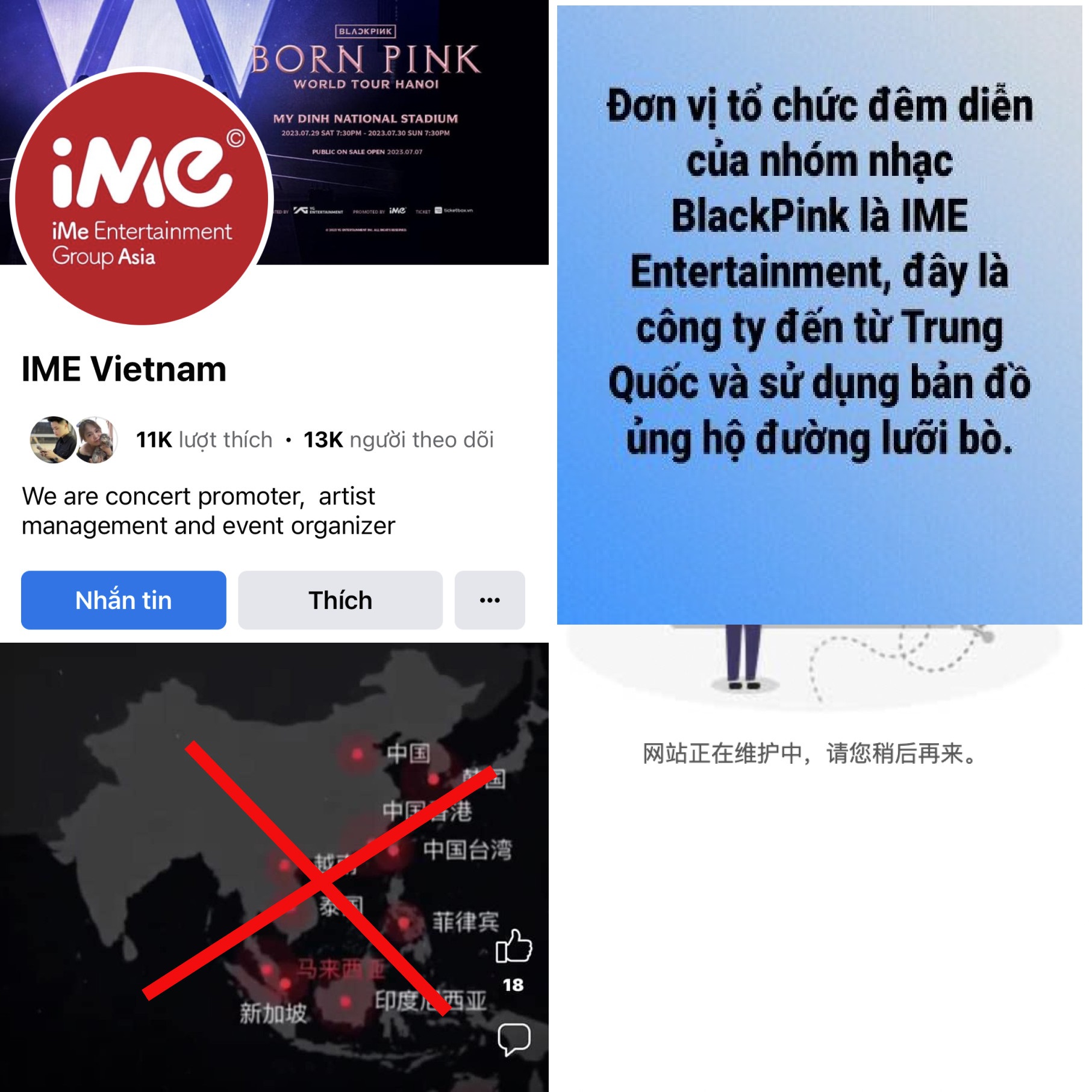 Hôm 4/7, khi ban tổ chức công bố giá vé concert Born Pink, nhiều khán giả phát hiện trang chủ website đơn vị này đăng bản đồ có hình ảnh “đường lưỡi bò” phi pháp. Nhiều người chụp lại hình ảnh, thể hiện thái độ bức xúc và còn kêu gọi tẩy chay show.