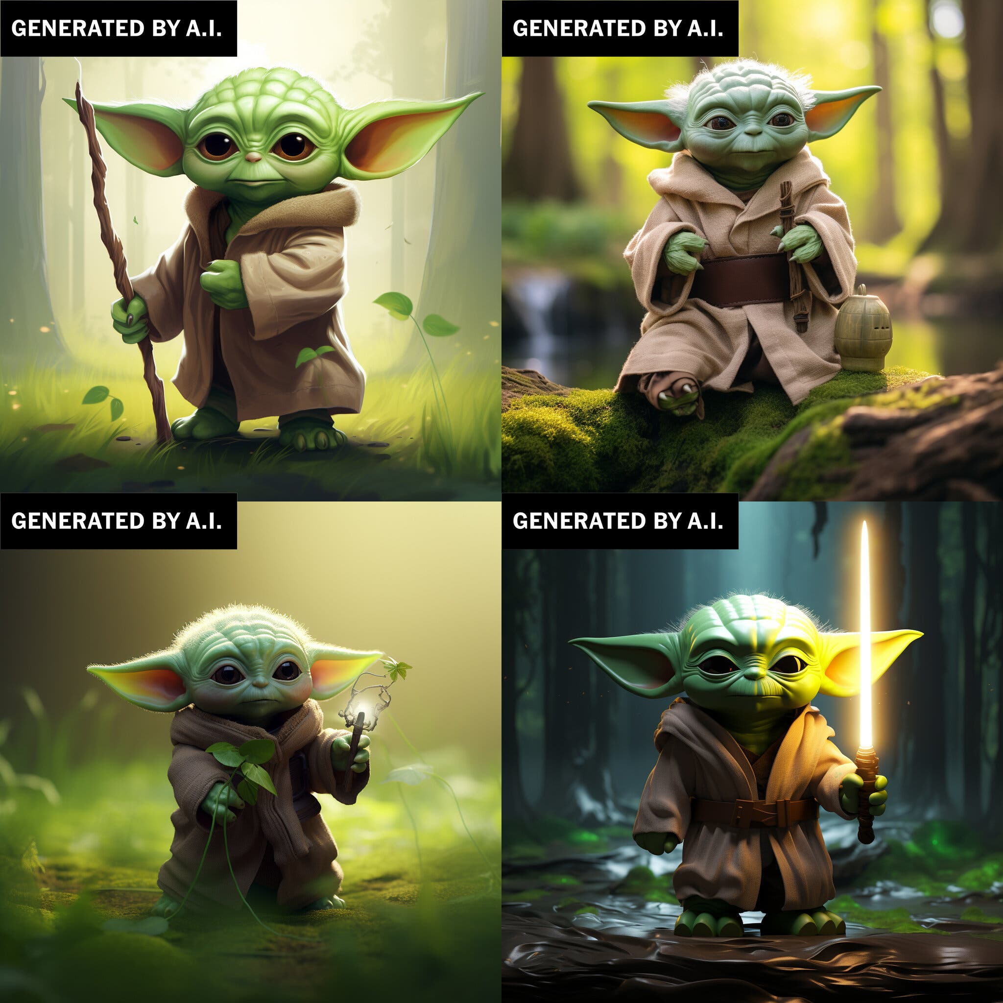 Một câu hỏi khác, đó là chúng ta nên nghĩ thế nào về khả năng vi phạm bản quyền nội dung của AI? Luật bản quyền hiện hành được ban hành để bảo vệ các tác phẩm sáng tạo cụ thể chứ không phải một phong cách sáng tạo chung. Khi tôi yêu cầu MidJourney sản xuất cho tôi bức ảnh “một anh chàng nhỏ bé màu xanh lá cây đã huấn luyện Jedi trong 800 năm”, kết quả của nó khá nổi bật.